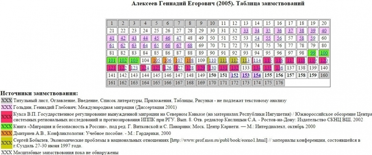 Далее ""Диссернет" приводит названия первоисточников. Работа Гольдина «Международная миграция», труд Кукса «Государственное регулирование вынужденной миграции на Северном Кавказе (на материалах Республики Ингушетия)» и еще три научные работы других авторов, по мнению экспертов сайта, Алексеев выдал за свои. Стоит отдать должной полковнику, автором 80-ти страниц стал все же он. Об остальных частях диссертации судить нельзя, так как они заняты графическими изображениями.