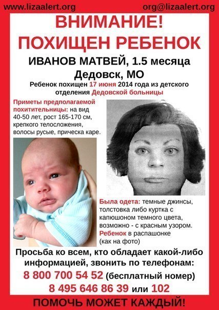 Сразу после рождения от Матвея отказались родители. Он находился в больнице, откуда его 17 июня беспрепятственно вынесла неизвестная женщина. К поискам малыша сразу приступили полицейские и волонтеры.