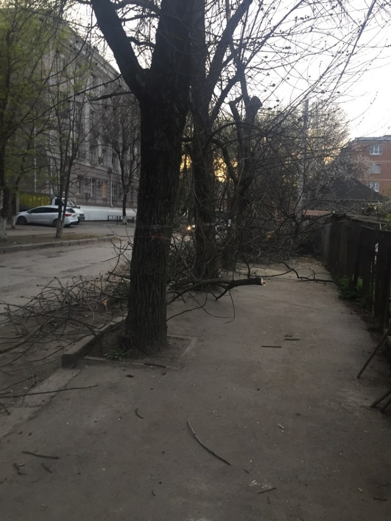 Ростовские коммунальные службы спилили деревья и бросили ветки на тротуаре в центре города.