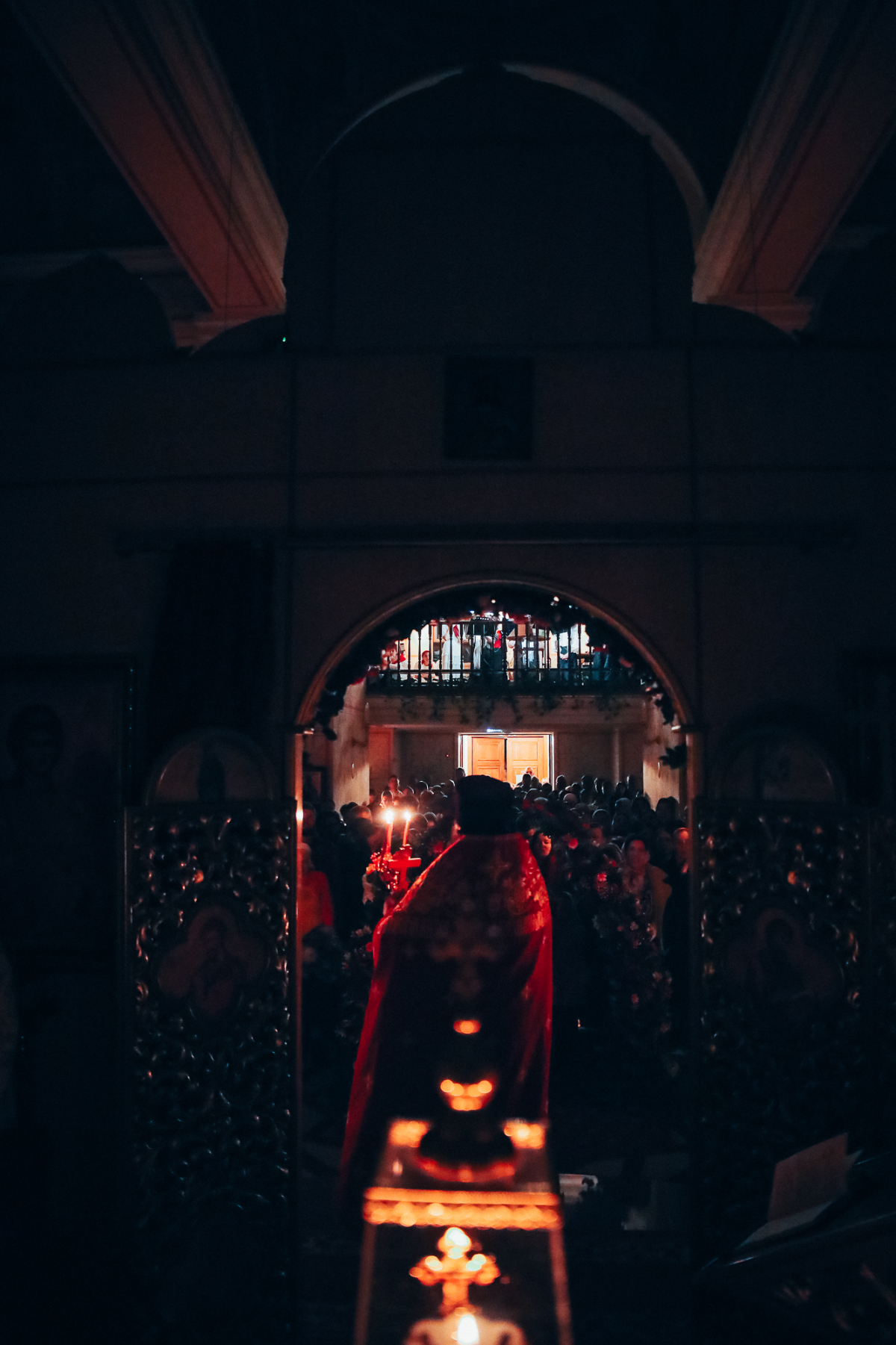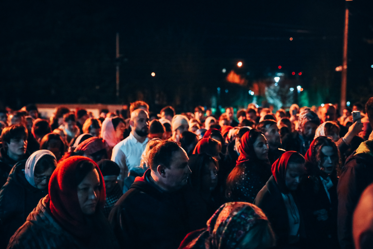 Фотографу удалось запечатлеть не только масштаб торжества, но и его сокровенные детали: мягкие отблески лампад в глазах прихожан, золотое свечение икон в сизой дымке ладана и яркое разноцветье пасхальных корзин.