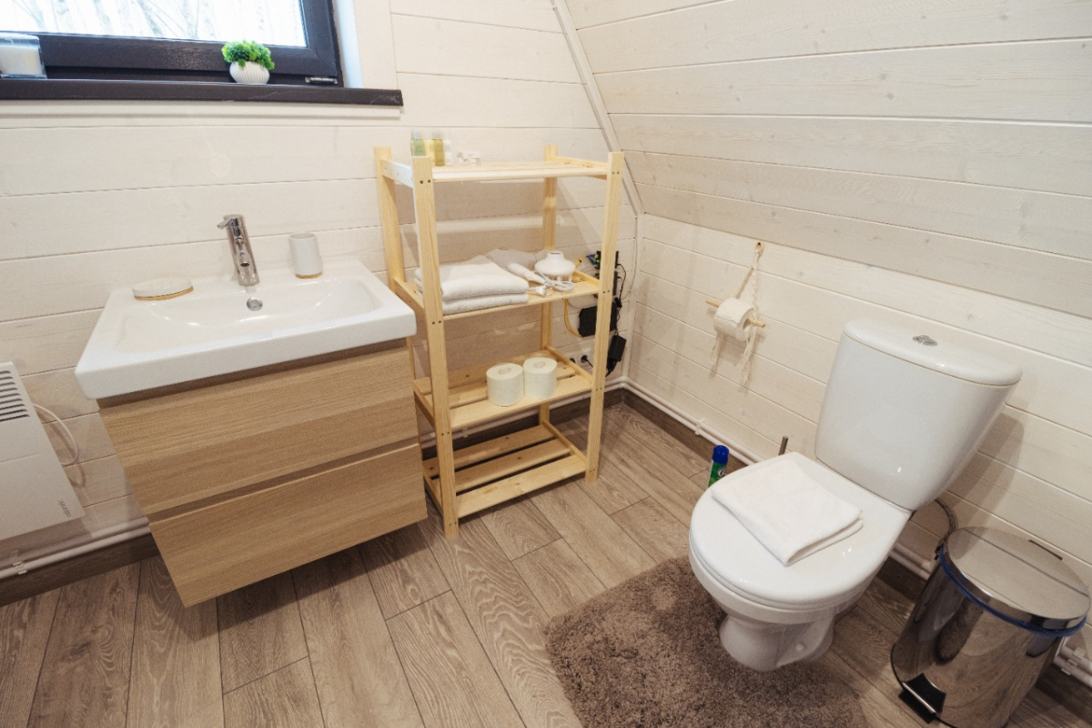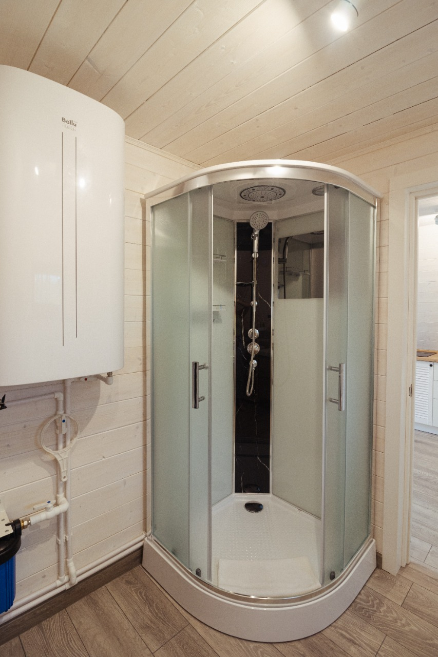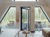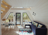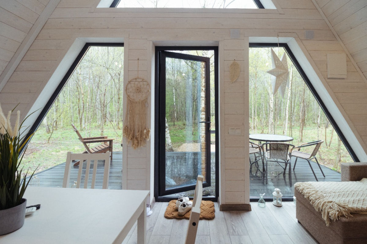 Пожалуй, одно из главных достоинств дома после необычной треугольной формы - это панорамное остекление. Такие окна не только открывают чудесный вид на окружающую природу, но и благодаря добавлению аргона намного эффективнее любых стандартных тройных стеклопакетов, которые установлены в наших квартирах. Летом окна позволяют отсечь лишний ультрафиолет, а в зимний период они не выпускают тепло.