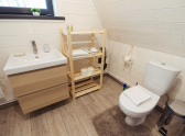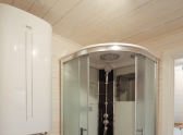 Внутренняя отделка дома выполнена из имитации бруса. Интересно, что боковые стены можно поднять до 120 см от пола, что дает улучшенную эргономику пространства - если бы скат был в пол, то мебель бы занимала больше пространства. Помимо углов поднятые стены увеличивают площадь пола на втором этаже, а также делают конек выше, а экстерьер изящнее.