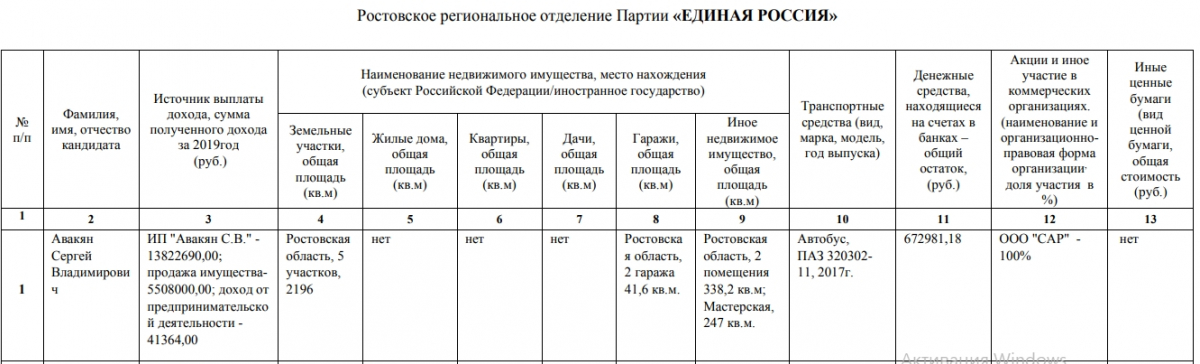Также указано, что в собственности у Авакяна есть пять земельных участков общей площадью 2196 квадратных метров, два гаража площадью 41,6 «квадратов». Также у депутата есть два помещения и мастерская. На Авакяна записан автобус ПАЗ 2017 года выпуска.