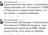 - Единственный пока плюс: остановлено представление нач. Ростовского ГУМВД А.Ларионов к генерал-лейтенанту, а 2 его замов - к генерал-майорам, - добавил Александр Хинштейн.