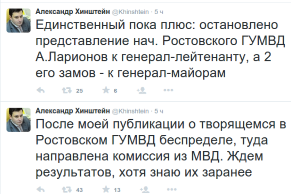 - После моей публикации о творящемся в Ростовском главке беспределе, туда направлена комиссия из МВД. Ждем результатов, хотя знаю их заранее, - написал в своем микроблоге депутат.