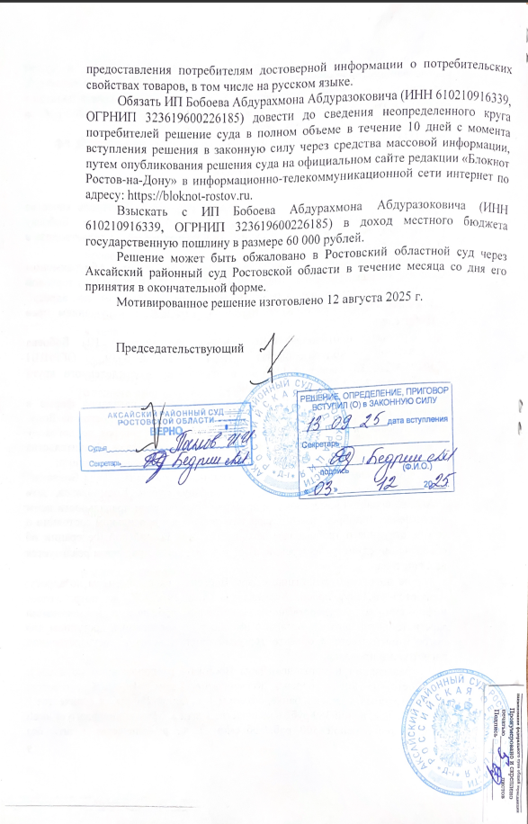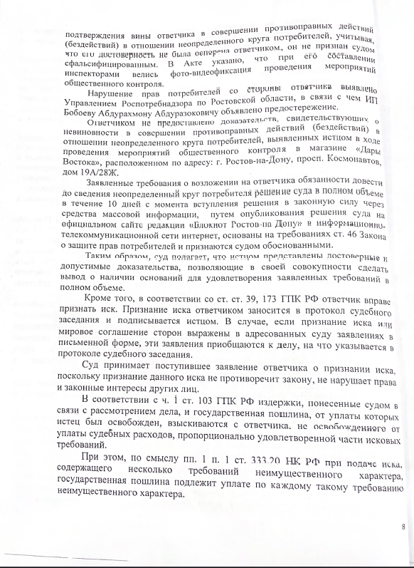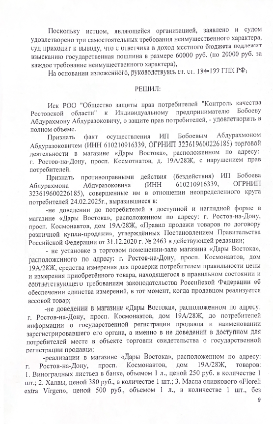 области" к Индивидуальному предпринимателю Бобоеву Абдурахмону