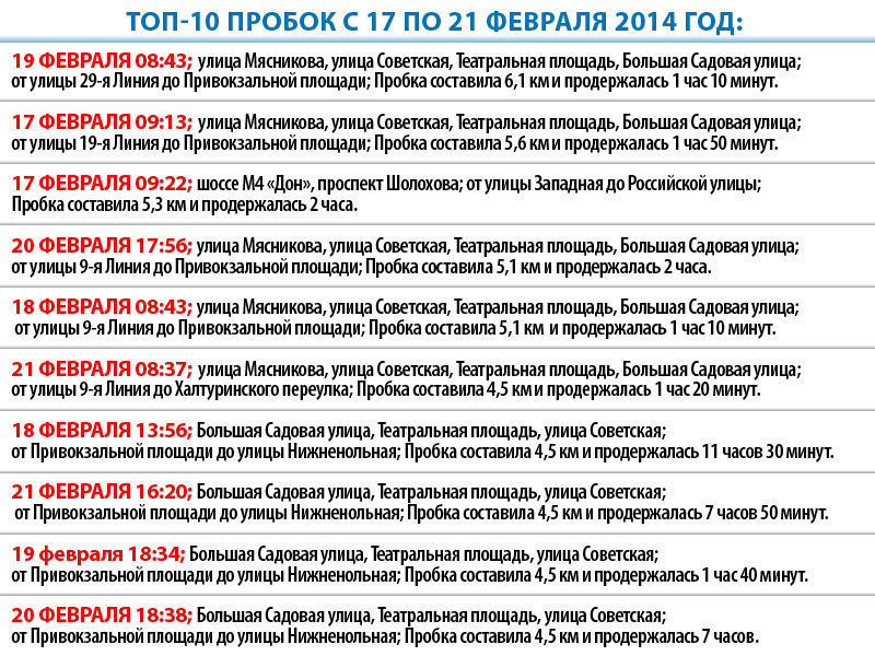 Основные затруднения автовладельцы испытали утром 17 февраля, в первый рабочий день после закрытия моста: максимальная загруженность дорог в городе составила 7 баллов. Также большие затруднения водители испытали в четверг, 20 февраля, заторы оценивались в 8 баллов из 10. В остальные дни на дорогах донской столицы было свободнее, чем обычно: в утренние и вечерние часы пик пробки достигали отметки в 6 баллов, а днем загруженность держалась на уровне 4.