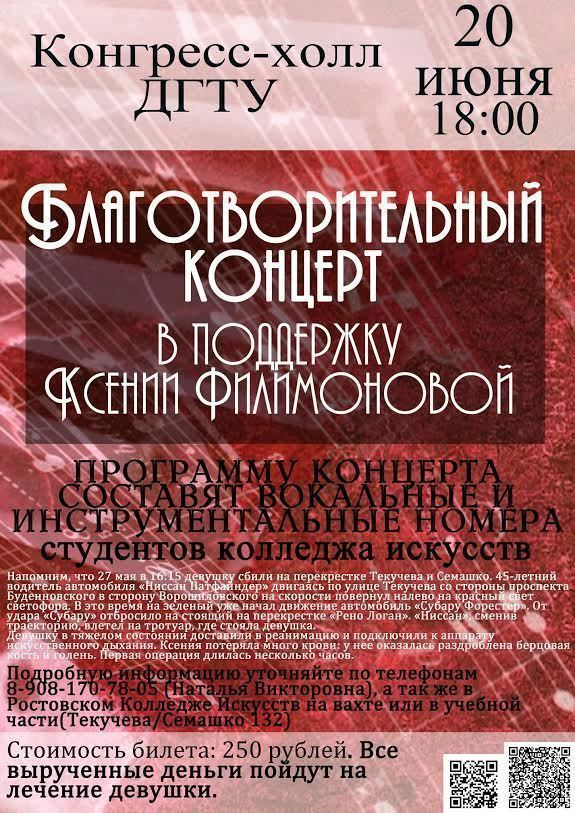 - Билеты можно приобрести в самом колледже искусств, а также у организаторов мероприятия: 8-908-170-78-05 (Наталья Викторовна), 8-989-700-33-60 (Руслан). Все вырученные деньги будут перечислены семье Ксении Филимоновой, - рассказали в информационной службе ДГТУ.