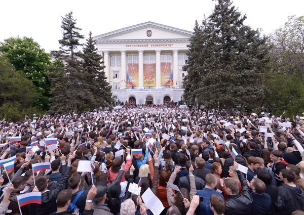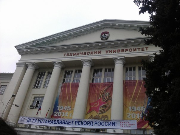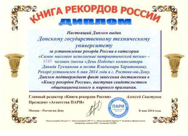Ростовчане установили рекорд России, исполнив песню «День Победы». Почти 10 тысяч человек - сотрудники и студенты ДГТУ, кадеты, воспитанники детских садов, хор ветеранов ВОВ, а также горожане - собрались на площади Гагарина.