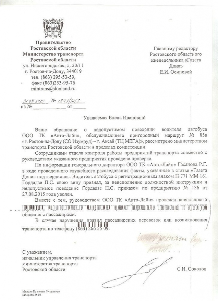 - Водитель автобуса с регистрационным знаком Н 771 ММ 61 Гордадзе П.С. свою вину признал, за неисполнение должностной инструкции и недопустимое поведение Гордадзе П.С. приказом по предприятию №186 от 27.08.2015 года уволен. Вместе с тем, руководством ООО ТК «Авто-Лайн» проведен внеплановый инструктаж водителей автобусов, осуществляющих пассажирские перевозки, о недопустимости нарушения правил дорожного движения и правил общения с пассажирами, - говорится в документе.