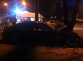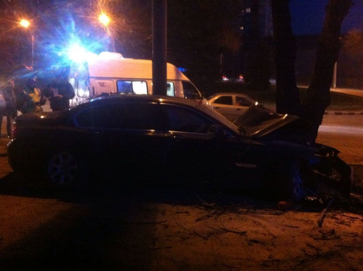 Молодой человек, находясь за рулем BMW7 , не справился с управлением, вылетел с проезжей части, снес дорожный знак, а потом врезался в дерево.