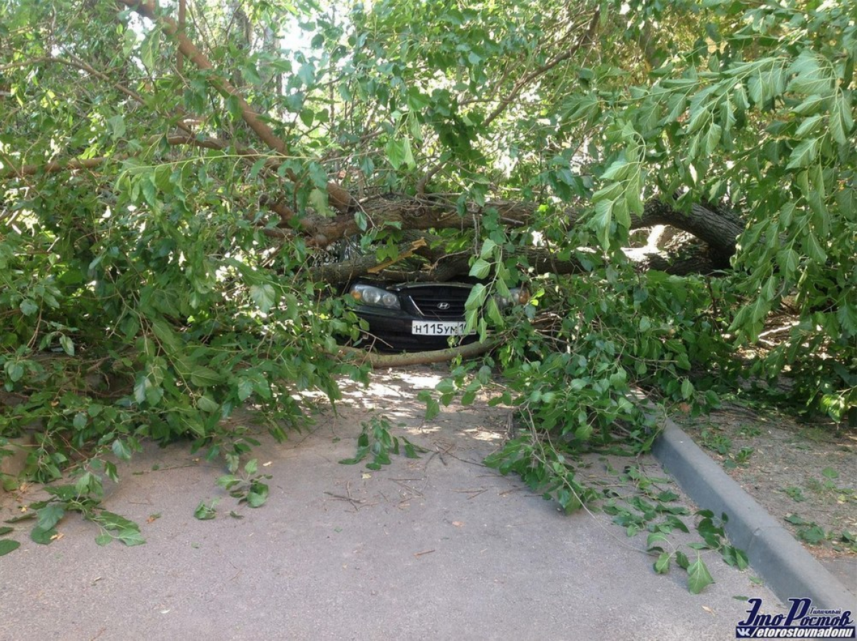 Крона очутилась прямо на капоте "Хендая" . Также ствол перегородил въезд во двор и оказался на детской площадке.