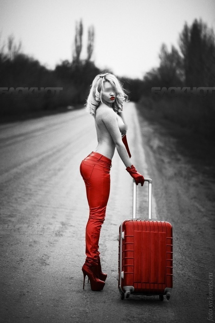Молодую маму снимал пожарный, являющийся по совместительству блогером. Волгодончанка выступила в образе женщины - вамп. Блондинка одела красные кожаные штаны, перчатки, а в качестве аксессуаров использовала чемодан того же цвета и маленькую сумочку.