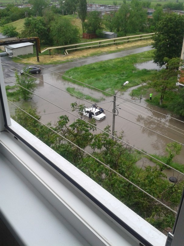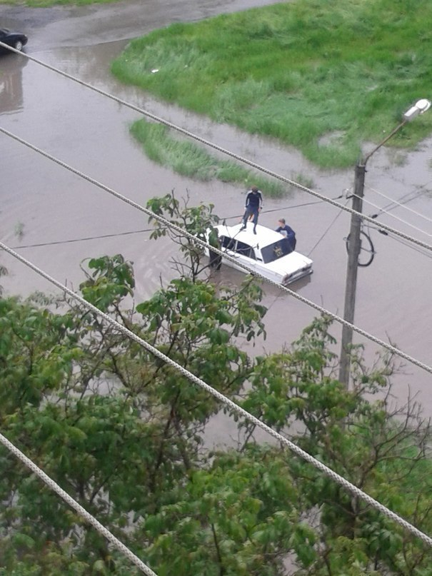 Подтоплены оказались дворы и низины, упало несколько деревьев. Автомобилистам сегодня пришлось не сладко. Вода затопила салона автомобилей. Прохожим приходится брести по улицам по колено в воде. А некоторые и вовсе забрались на машину, видимо, побоявшись переходить затопленную дорогу.