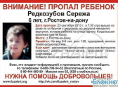 В Ростове-на-Дону полицейские и волонтеры разыскивают 6-летнего Сережу Редкозубова, который пропал утром 23 сентября. Около половины восьмого утра мальчик вышел из дома по улице Фрунзе вместе с дедушкой. Мужчина ненадолго отлучился, оставив ребенка одного, а когда вернулся, внука у подъезда уже не было.