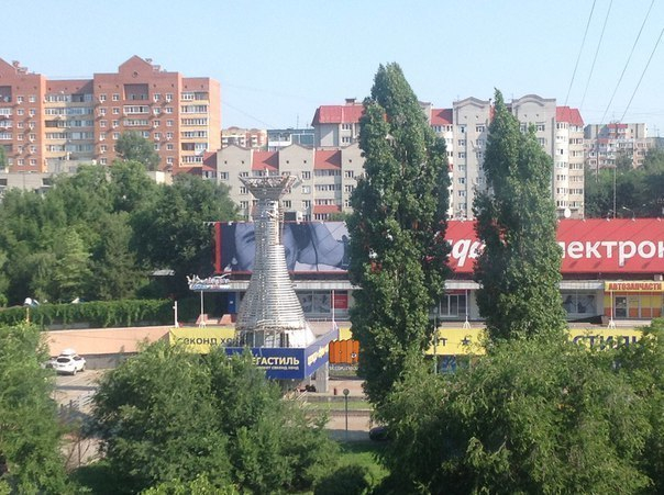 Сейчас рабочие демонтируют многометровую кеглю серебристого цвета, в которую была «спрятана» винтовая лестница. Фигура причудливой формы много лет находилась на площадке у огромного здания.