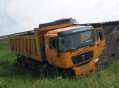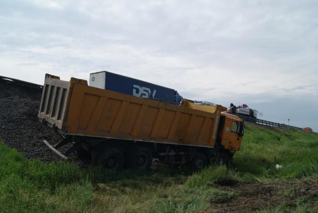 По неустановленным пока причинам, большегруз съехал на обочину и завис в опасном положении над дорожной насыпью на металлическом отбойнике.